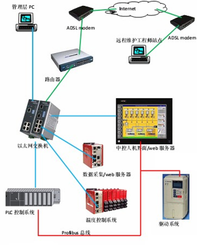 本系統(tǒng)舍棄了 Modem 撥號方式的遠程連接模式,而采用了基于ADSL網(wǎng)絡(luò)的遠程維護系統(tǒng)。廠家不僅能對 PLC程序也可以對人機界面和溫控模塊的程序進行遠程更新和維護,大大提高了檢修的速度和方便程度。