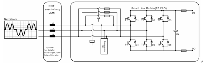 整流/回饋單元把交流電源轉(zhuǎn)換為電壓穩(wěn)定的直流電源,即使在逆變器能量回饋到電網(wǎng)時,該電壓在規(guī)定范圍內(nèi)仍保持恒定,其原理如圖3所示。該整流/回饋單元使用IGBT的四象限運行,可以避免由于電網(wǎng)故障等引起的逆變器換向失敗。